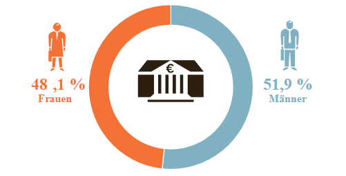 Abbildung 1 aus dem Handelsblatt: Der Beschäftigungsanteil aller befragten Institute im Banksenktor liegt durchschnittlich bei 48,1 Prozent Frauen und 51,9 Prozent Männern. Das bedeutet, nahezu die Hälfte der Angestellten sind Frauen.