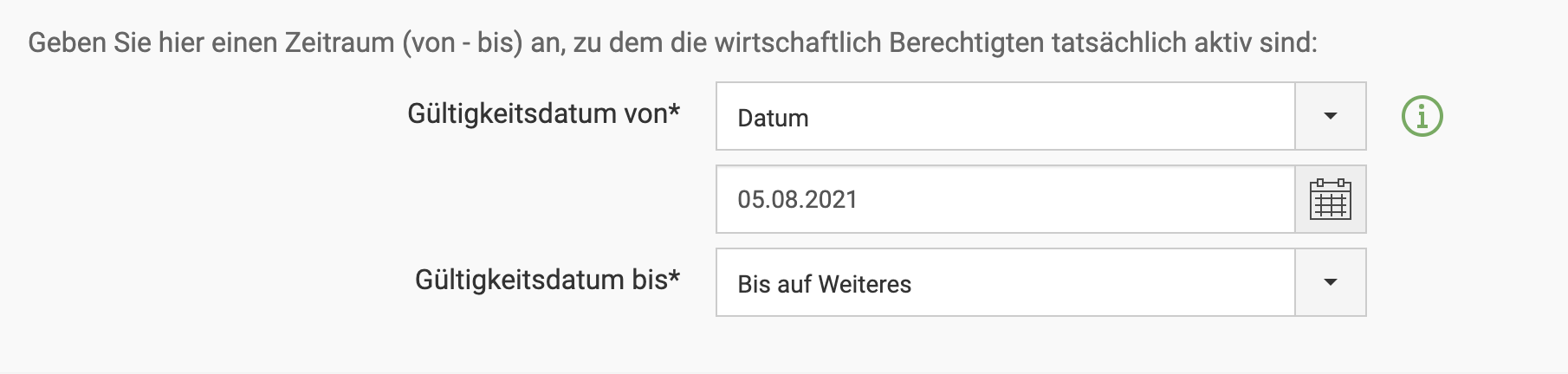 Schritt 10: Gib in das Gültigkeitsdatum von: „Errichtungsdatum" und Gültigkeitsdatum bis: „Bis auf weiteres" ein. (Errichtungsdatum findest du in deinem FELSFO Account oder in deinem Errichtungsprotokoll)