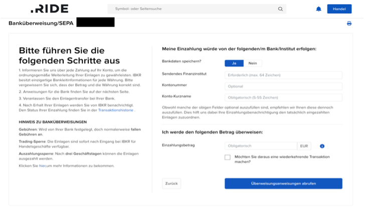 7.) Gebe deine Bankdaten und deinen gewünschten Einzahlungsbetrag an und klicke anschließend auf „Überweisungsanweisungen abrufen“.