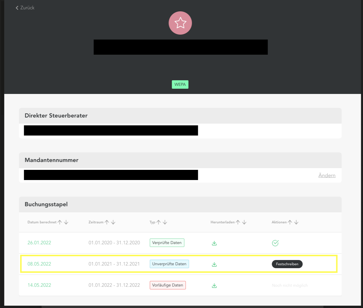Achtung: Sobald die Daten festgeschrieben sind, können diese nicht mehr geändert werden. Der/die Drittsteuerberater:in erhält zu diesem Zeitpunkt eine Benachrichtigung, damit er/sie mit der Erstellung des Jahresabschlusses beginnen kann.