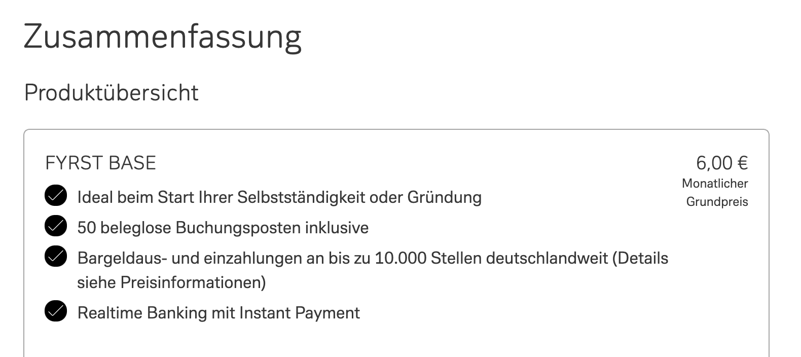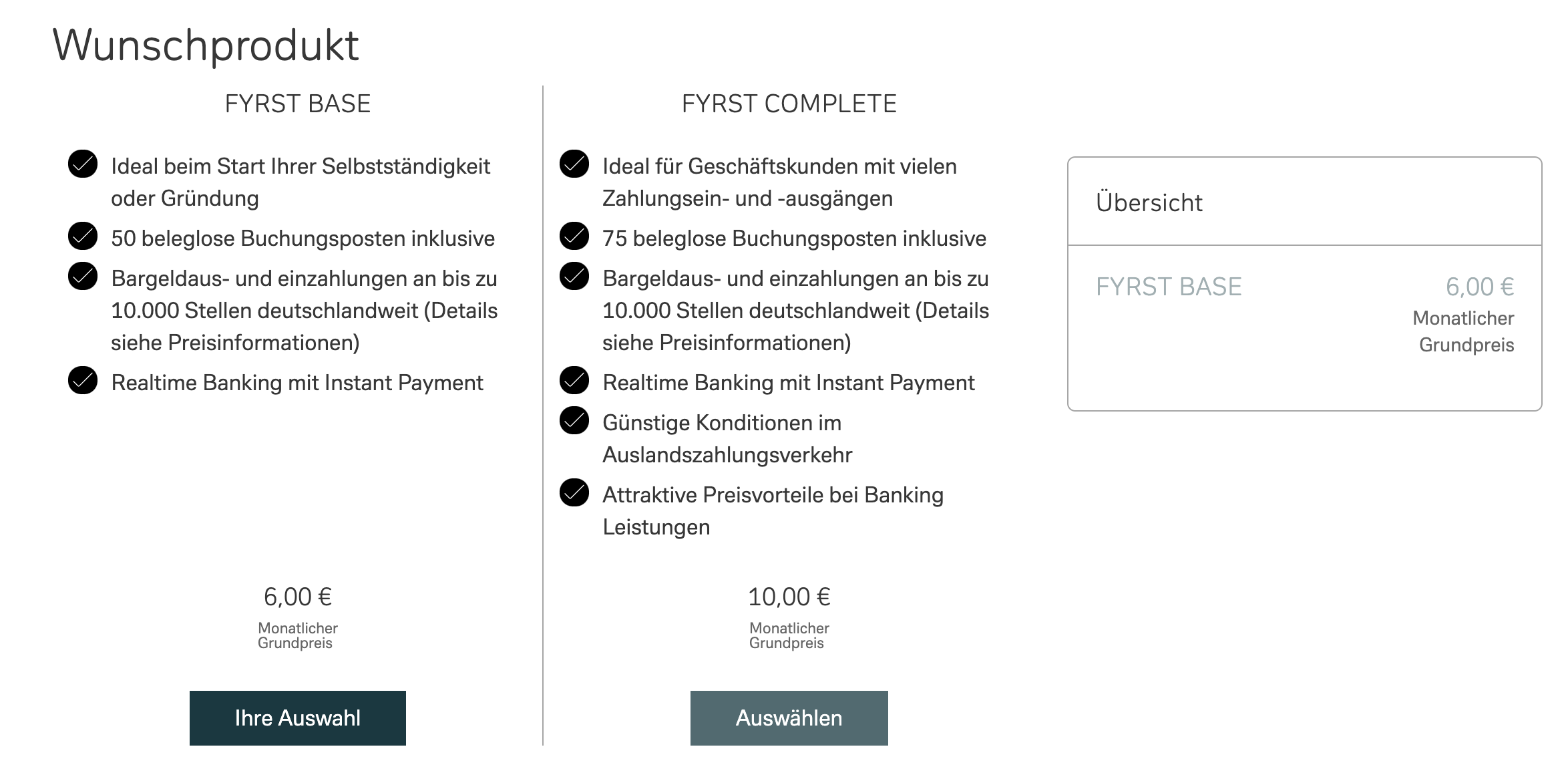 2, Wähle dein Wunschkonto mit den zusätzlichen Leistungen. Wir empfehlen das FYRST Base Konto. Ein Unterkonto ist in der Regel nicht notwendig, kann aber bei mehreren Gesellschaftern hilfreich sein.