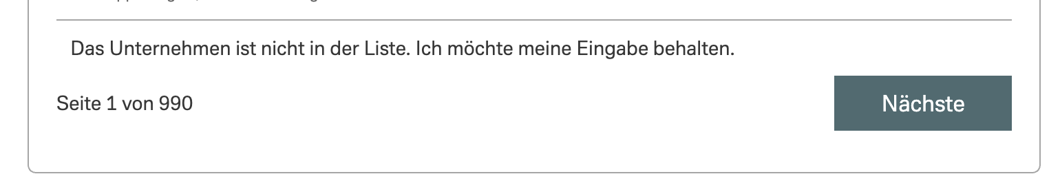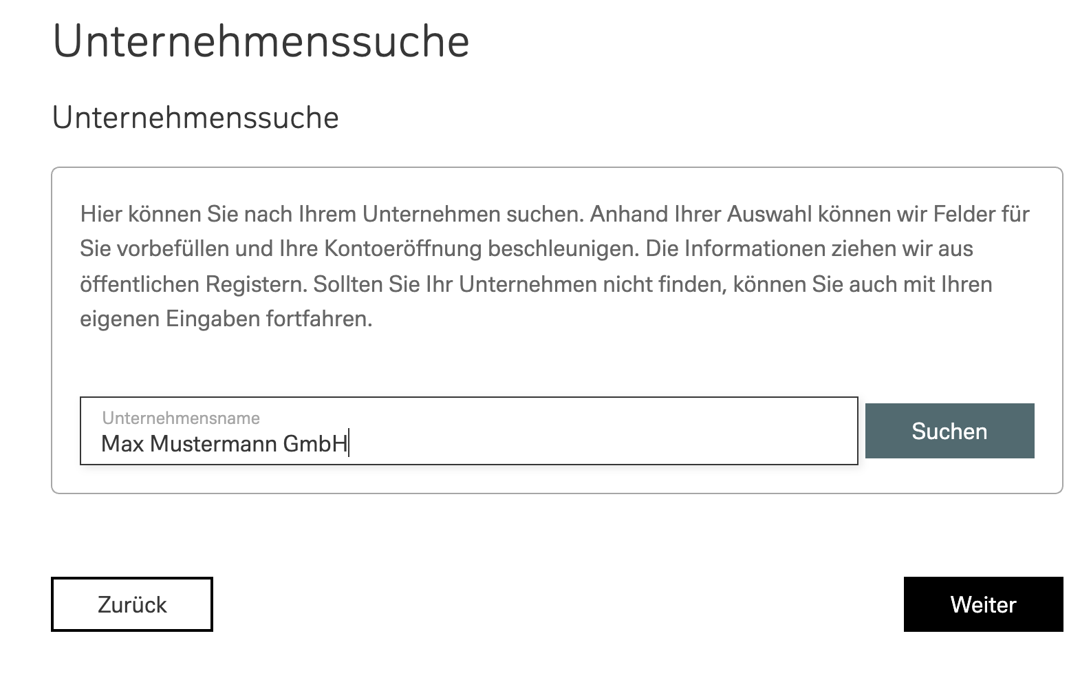 3. Bei der Unternehmenssuche muss mit den eigenen Angaben fortgefahren werden, da die GmbH noch nicht im Handelsregister eingetragen ist. Klicke hierzu auf "Suchen" und wähle den Link "Das Unternehmen ist nicht in der Liste. Ich möchte meine Eingabe behalten".