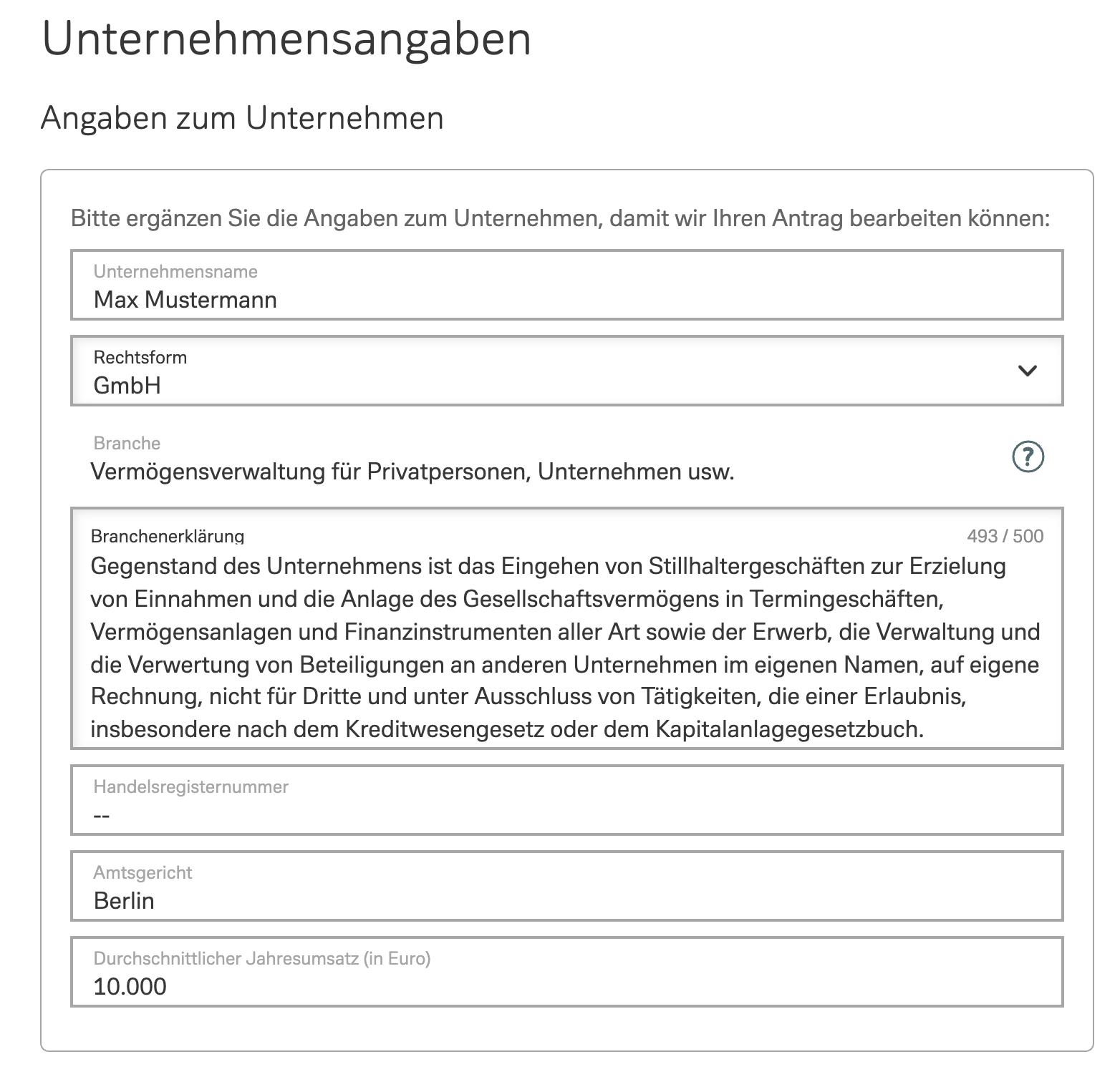 4. Anschließend müssen die Angaben zum Unternehmen manuell gemacht werden. Als Branchenerklärung kann der Gesellschaftszweck aus dem Gesellschaftsvertrag entnommen werden. Bei der Handelsregisternummer müssen mindestens zwei Striche eingefügt werden, der durchschnittliche Jahresumsatz muss individuell eingegeben werden. Als Branche kann "Vermögensverwaltung, Day Trading, Option oder Aktien" angegeben werden, dies ist auch von der jeweiligen GmbH abhängig, es können auch die zusätzlichen operativen Branchentätigkeiten hinzugefügt werden.