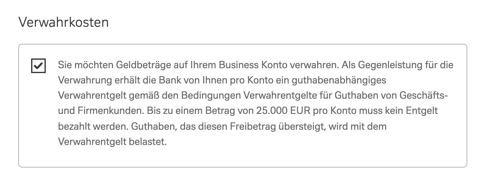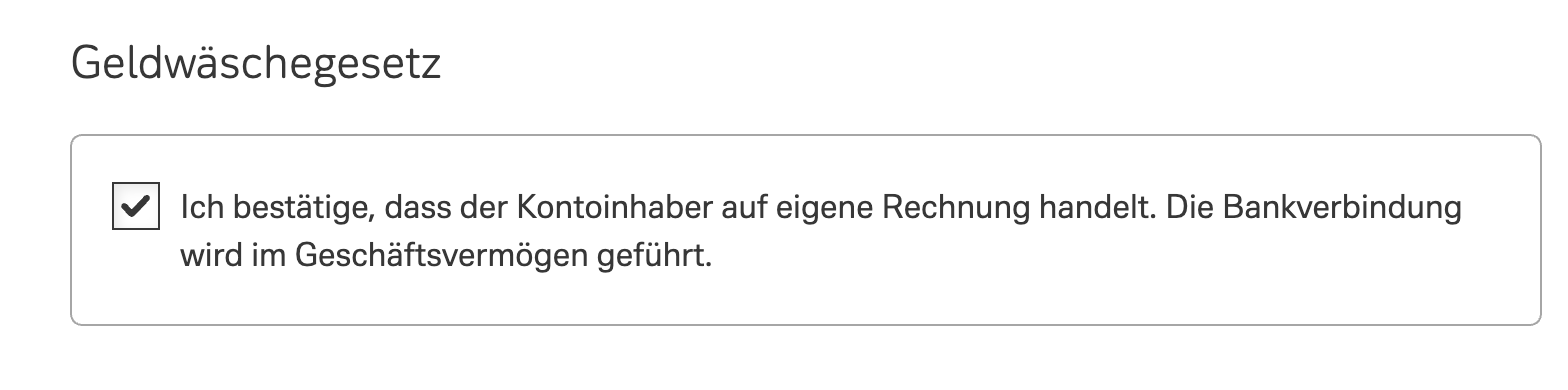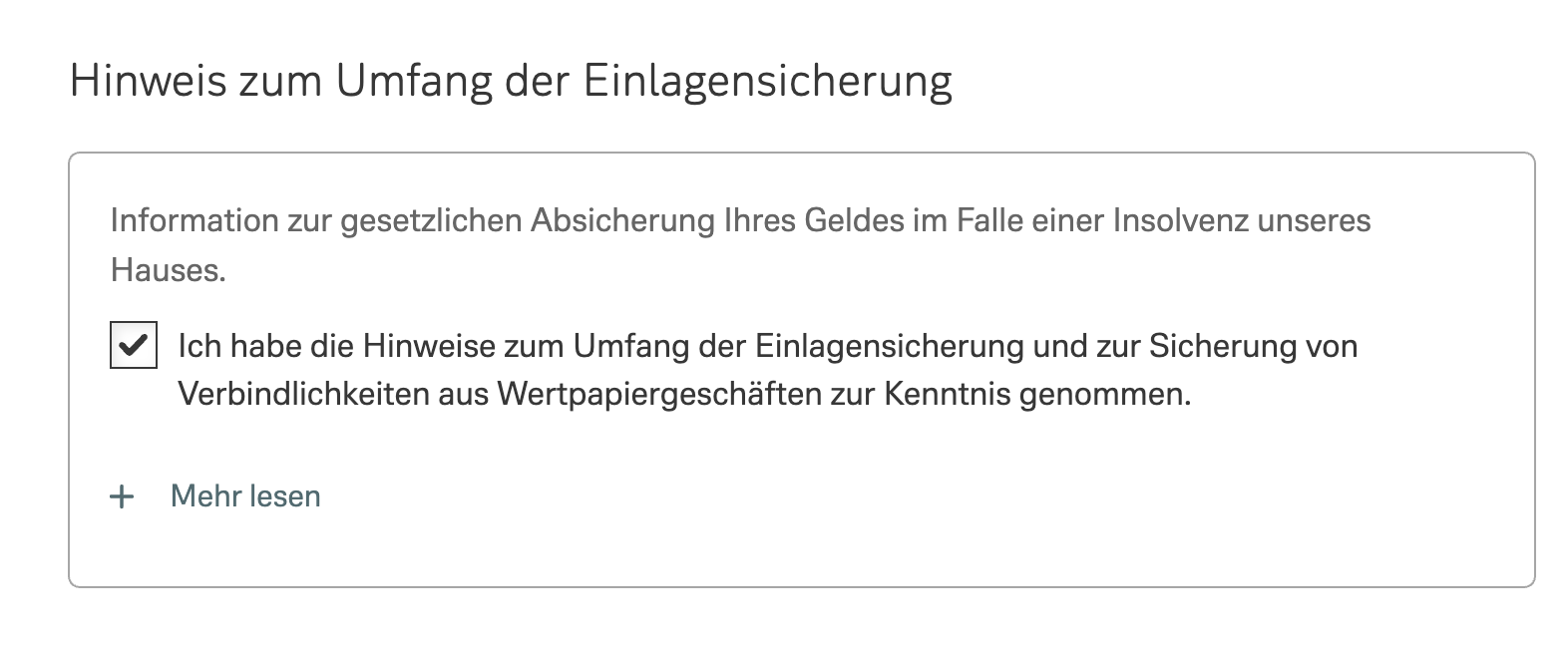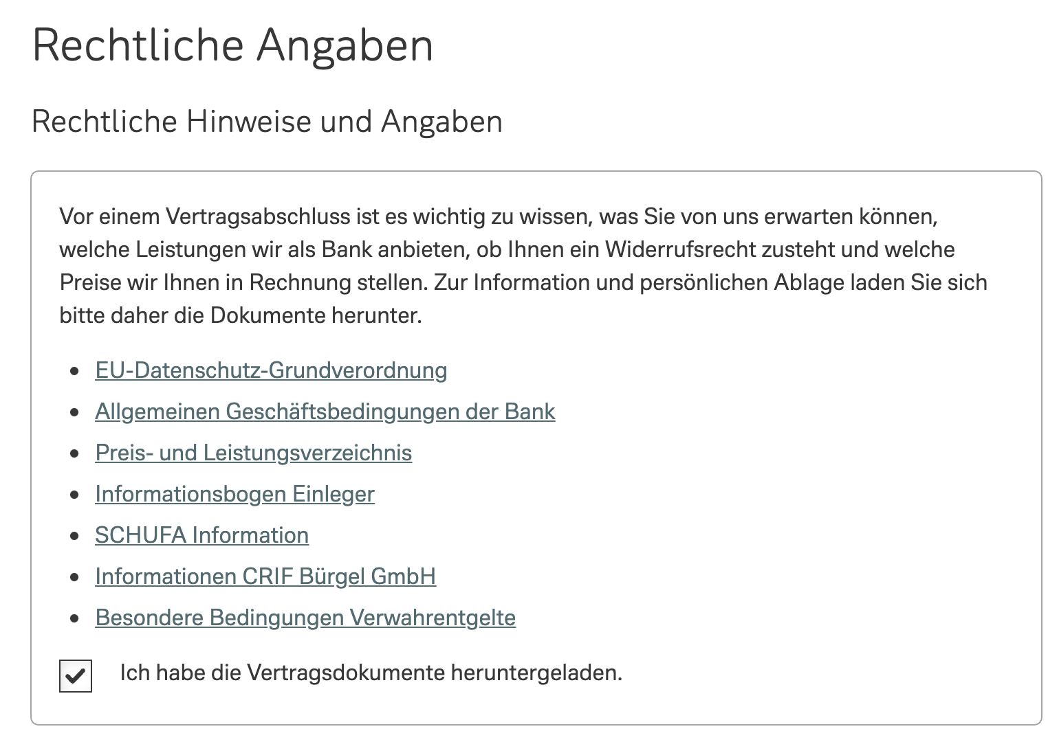 7. Rechtliche Angaben: Hier muss die Kenntnisnahme zur Einlagensicherung, Verwahrkosten und zum Geldwäschegesetz bestätigt werden.