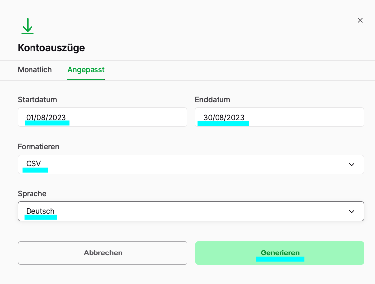 3. Wähle den Zeitraum aus und als Format "CSV". Klicke anschließend auf "Generieren".