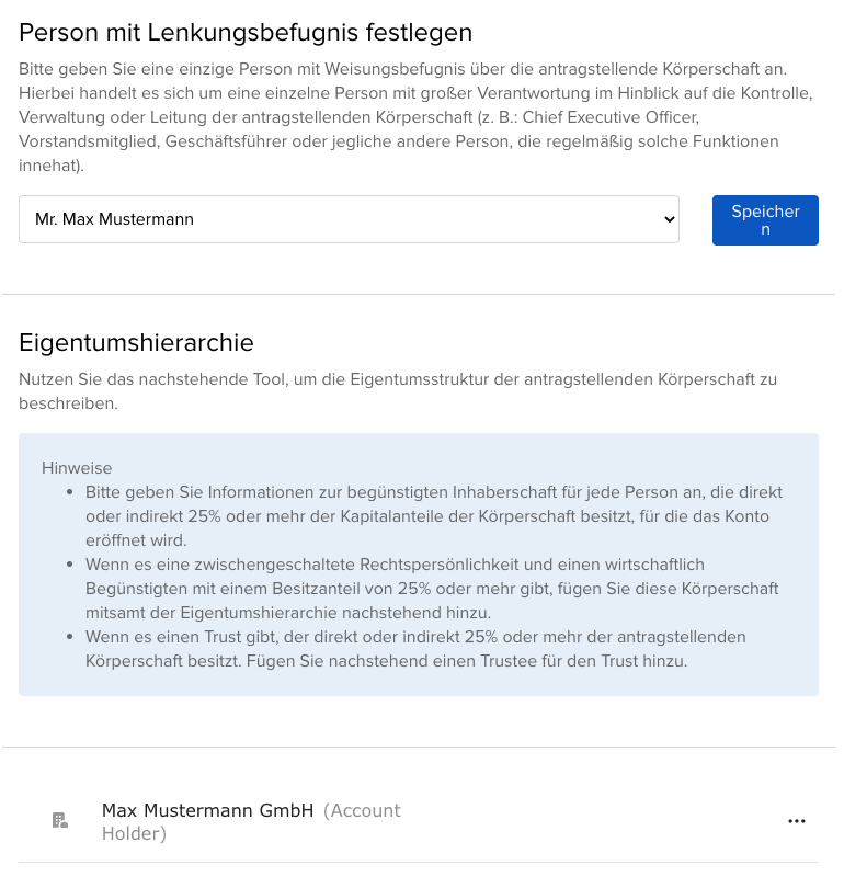 Schritt 17: Lege die Person mit Lenkungsbefugnis fest und füge wirtschaftlich berechtigte Personen (mehr als 25 Prozent der Kapitalanteile) ein.