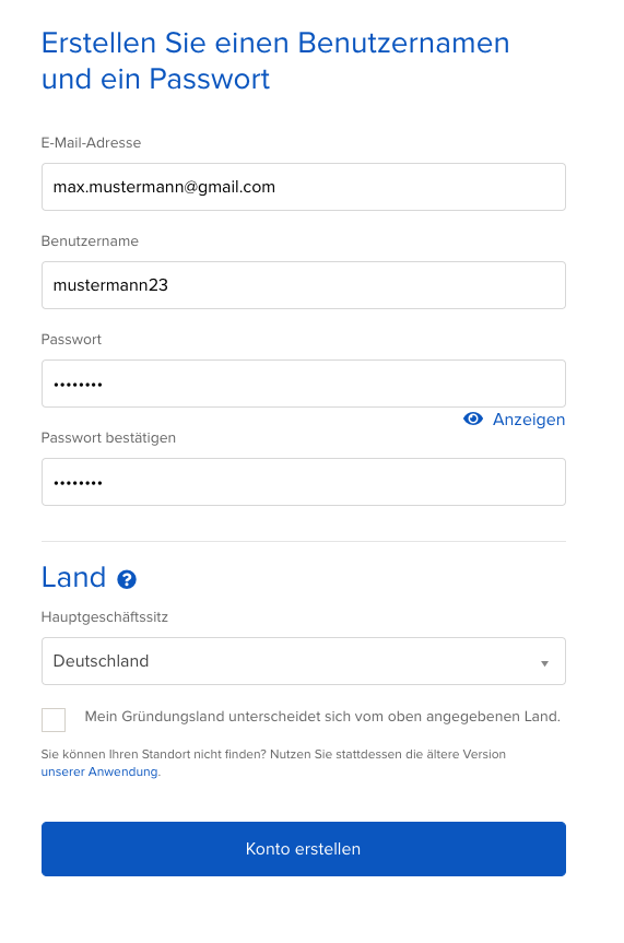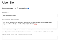 Schritt 5: Trage den Namen der GmbH ein und übernehme die Beispielbeschreibung von FXFlat als Geschäftstätigkeit. (Achtung: Es dürfen hier keine Umlaute benutzt werden!)