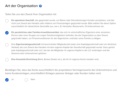 Schritt 5: Wähle als Art der Organisation den zweiten Punkt aus und bestätige, dass nur das eigene Vermögen verwaltet wird. Füge anschließend deine Kontaktdaten hinzu.
