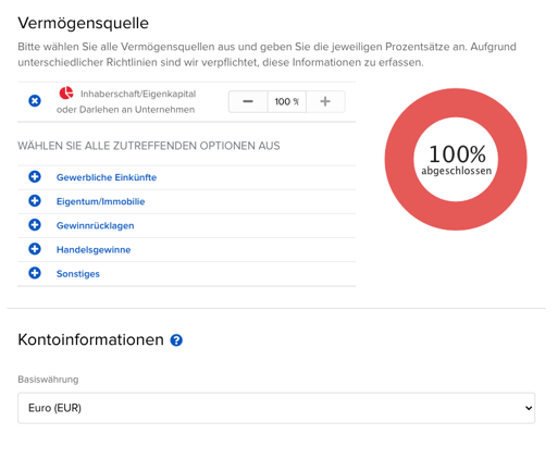 Hier muss angegeben werden auf welche Art und Weise das Vermögen angehäuft wurde und wie viel Prozent es vom Gesamtvermögen ausmacht. Folgend ist eine Liste mit Möglichkeiten, die zutreffen könnten, wobei Einkünfte aus dem Gehalt generell als unkritisch betrachtet werden. Bei Gewinnen aus Kryptowährungen oder Immobilien können weitere Rückfragen entstehen.