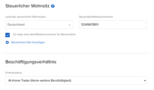 Schritt 12: Gib deine persönliche Steuernummer sowie das Beschäftigungsverhältnis an. Das Beschäftigungsverhältnis ist individuell verschieden, aber auf viele dürfte die Option "At-Home Trader" zutreffen.