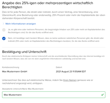 Schritt 17: Lege die Person mit Lenkungsbefugnis fest und füge wirtschaftlich berechtigte Personen (mehr als 25 Prozent der Kapitalanteile) ein.