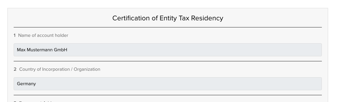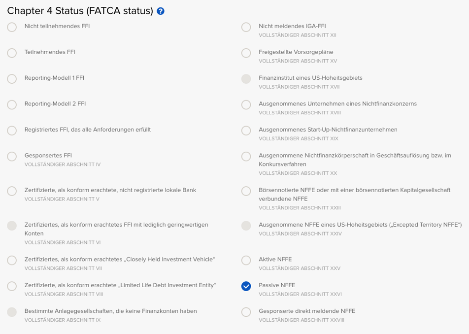 Folgende Felder müssen ausgefüllt werden: Der FATCA Status ist "Passive NFFE":
