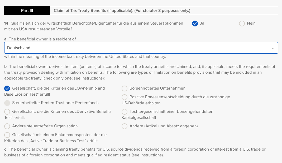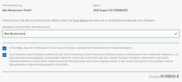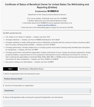 Schritt 20: Ausfüllen des W-8BEN-E Formular. Hier sind viele Felder bereits vorausgefüllt.