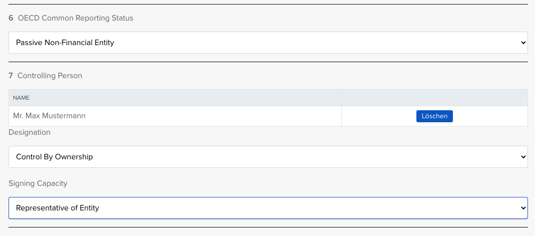 Wähle im Punkt 6 "Passvie Non-Financial Entity" und gib eine Kontrollperson an.