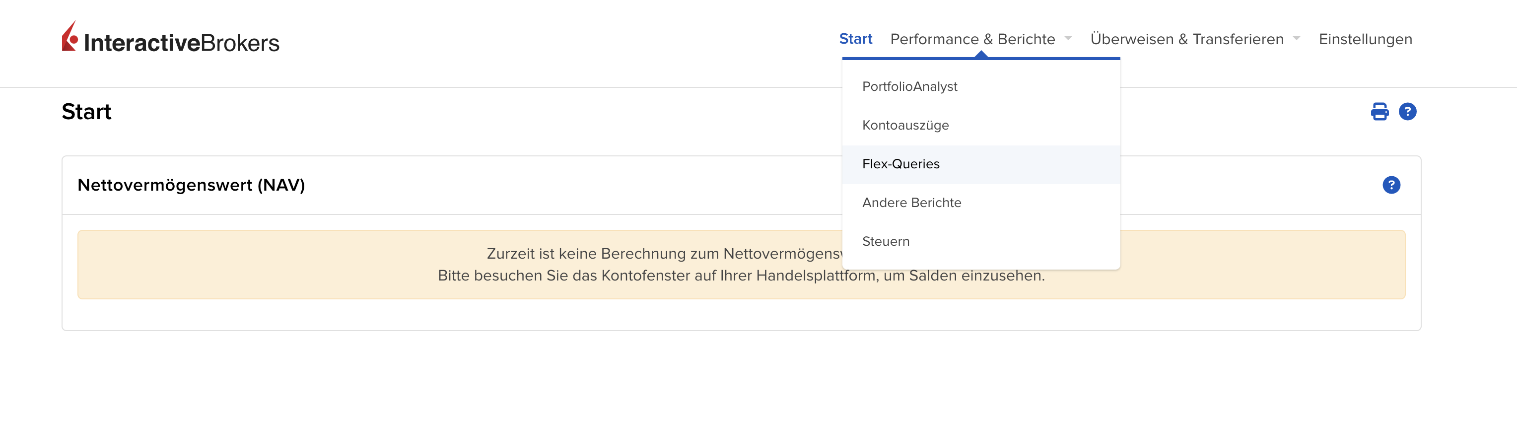 Es kann sein, dass die Benutzeroberfläche von IB etwas anders aussieht. Dann sollte das Navigationsmenü auf der linken Seite zu finden sein. Hier bitte auch über die Navigation auf den Reiter "Flex-Queries" klicken.