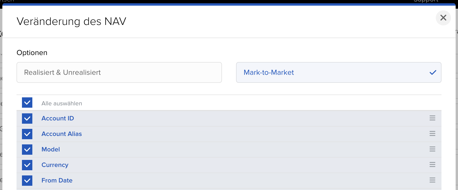 3. Abschnitt Veränderung des NAV: Das Feld "Realisiert & Unrealisiert" ist nicht anzuklicken.